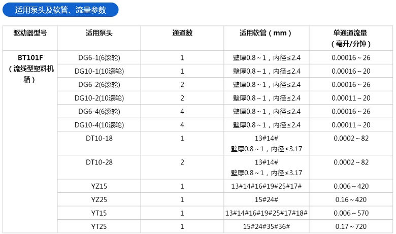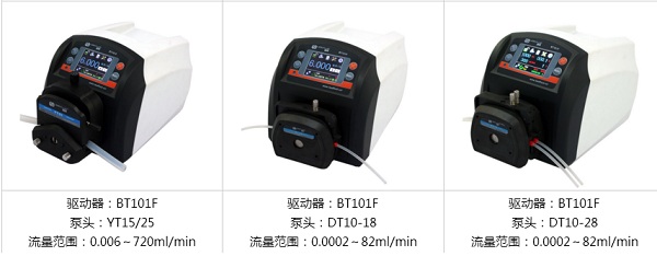 BT101F分配型智能蠕動(dòng)泵流量范圍0.00011~720毫升/分鐘。采用彩色液晶和觸摸屏技術(shù),操作界面簡(jiǎn)單,直觀,明了。主要適用于各種復(fù)雜的液體定量分配,適用于精確計(jì)量和定量給料,可以實(shí)現(xiàn)高精度的流量傳輸控制。對(duì)液量分裝精度要求高時(shí),使用液量分配模式更加方便;對(duì)產(chǎn)量要求高時(shí),使用時(shí)間分配模式更加方便;需要將一定液體分裝為若干份液體時(shí)請(qǐng)使用復(fù)制分配模式。設(shè)置為流量模式時(shí),完全等同于一臺(tái)流量型蠕動(dòng)泵。為了減小不必要的風(fēng)扇噪音,采用了智能溫控技術(shù)。在RS485通訊中,因?yàn)椴捎昧薓ODBUS協(xié)議,更易于與其他控制設(shè)備如計(jì)算機(jī),人機(jī)界面,PLC等連接。