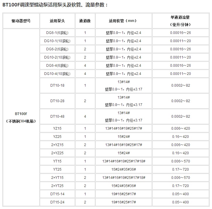 BT100F分配型智能蠕動泵流量范圍0.00011~720毫升/分鐘。采用彩色液晶和觸摸屏技術(shù),操作界面簡單,直觀,明了。主要適用于各種復雜的液體定量分配,適用于精確計量和定量給料,可以實現(xiàn)高精度的流量傳輸控制。對液量分裝精度要求高時,使用液量分配模式更加方便;對產(chǎn)量要求高時,使用時間分配模式更加方便;需要將一定液體分裝為若干份液體時請使用復制分配模式。設置為流量模式時,完全等同于一臺流量型蠕動泵。為了減小不必要的風扇噪音,采用了智能溫控技術(shù)。在RS485通訊中,因為采用了MODBUS協(xié)議,更易于與其他控制設備如計算機,人機界面,PLC等連接。