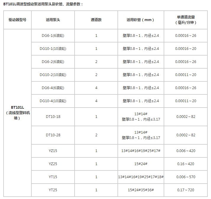 BT101L流量型智能蠕動泵流量范圍0.00011~720毫升/分鐘。采用彩色液晶和觸摸屏技術(shù),操作界面簡單,直觀,明了。主要適用于精準(zhǔn)流量傳輸控制,用戶可以根據(jù)自己的需要流量顯示,流量控制,流量累計。同時本產(chǎn)品實現(xiàn)了重復(fù)定時定量傳輸。適用于精確計量和定量給料,精度最高可達(dá)0.5%,為了減小不必要的蠕動泵噪音,采用了智能溫控技術(shù)。在RS485通訊中,因為采用了MODBUS協(xié)議,更易于與其他控制設(shè)備如計算機,人機界面,PLC等連接。