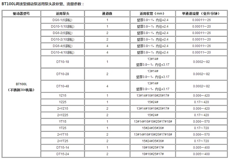 BT100L流量型智能蠕動(dòng)泵流量范圍0.00011~720毫升/分鐘。采用彩色液晶和觸摸屏技術(shù),操作界面簡(jiǎn)單,直觀,明了。主要適用于精準(zhǔn)流量傳輸控制,用戶可以根據(jù)自己的需要流量顯示,流量控制,流量累計(jì)。同時(shí)本產(chǎn)品實(shí)現(xiàn)了重復(fù)定時(shí)定量傳輸。適用于精確計(jì)量和定量給料,精度最高可達(dá)0.5%,為了減小不必要的蠕動(dòng)泵噪音,采用了智能溫控技術(shù)。在RS485通訊中,因?yàn)椴捎昧薓ODBUS協(xié)議,更易于與其他控制設(shè)備如計(jì)算機(jī),人機(jī)界面,PLC等連接。