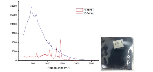 圖5 EVA塑料的785 nm和1064 nm光譜圖,藍(lán)色為785nm拉曼光譜,紅色為1064nm拉曼光譜,右邊為EVA塑料樣品
