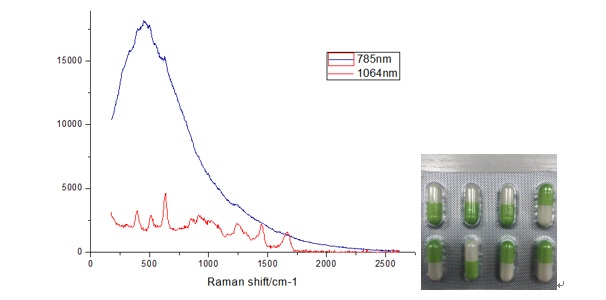 圖6 藥丸的785nm和1064nm拉曼光譜圖,藍(lán)色為785nm拉曼光譜,紅色為1064nm拉曼光譜,右邊為藥丸樣品