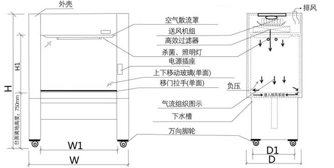 1、氣幕式隔離設(shè)計,防止內(nèi)外交叉污染,氣流30%外排70%內(nèi)循環(huán),負壓垂層流,無需安裝管道