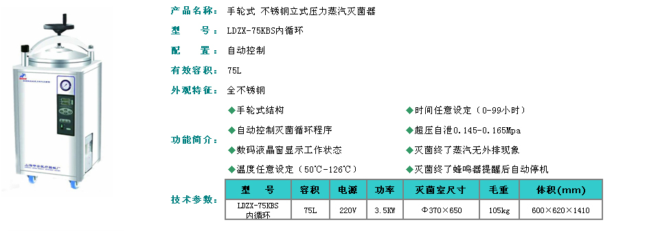 | LDZX-75KBS內(nèi)循環(huán)不銹鋼立式壓力蒸汽滅菌器 |