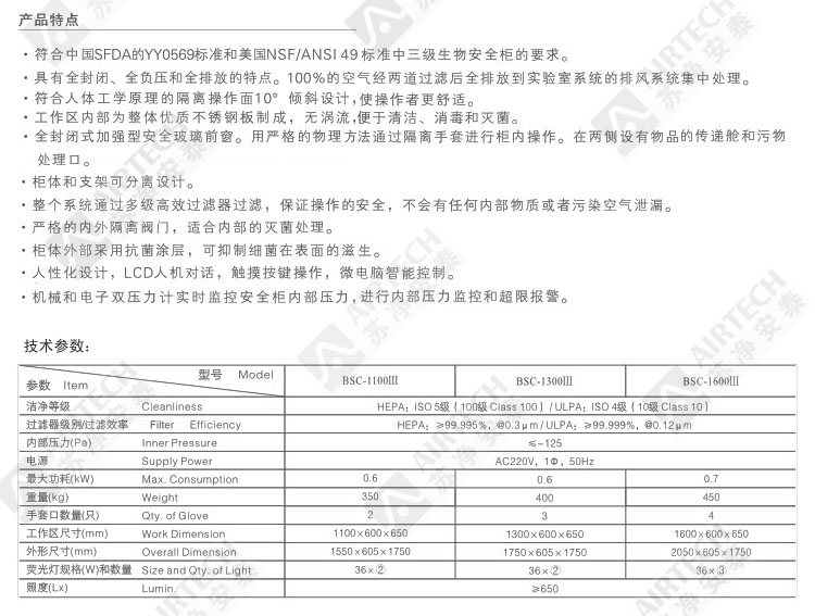 生物安全柜是用于生物安全實驗室和其它實驗室的生物安全防護隔離設(shè)備?梢苑乐褂泻腋∥⒘!馊苣z的擴散;對操作人員、樣品及樣品間交叉感染和環(huán)境提供安全保護。 本公司生產(chǎn)的生物安全柜嚴(yán)格按照國家醫(yī)藥行業(yè)強制性標(biāo)準(zhǔn)YY0569-2005、美國NSF/ANSI 49-2002和日本JISK3800:2000標(biāo)準(zhǔn)進行設(shè)計、制造和各類檢測。除采用美國大流量顆粒檢測系統(tǒng)對過濾器進行掃描檢漏和常規(guī)物理性能指標(biāo)檢測外,還專門建造了經(jīng)國外專家驗證合格的國內(nèi)生物安全柜生產(chǎn)企業(yè)中唯一的微生物檢測實驗室,對生物安全柜進行生物驗證測試。檢測人員都是經(jīng)日本有關(guān)機構(gòu)培訓(xùn)的專業(yè)人員,能最大程度保證產(chǎn)品質(zhì)量。 本公司生產(chǎn)的生物安全柜主要有BHC-ⅡA/B3(氣流70%循環(huán),30%排放)、BHC-ⅡA2(氣流70%循環(huán),30%排放)、BHC-ⅡB2(氣流100%排放)等系列。并采用優(yōu)質(zhì)高效空氣過濾器(HEPA)或超高效空氣過濾器(ULPA)供用戶選擇。 采用優(yōu)質(zhì)高效空氣過濾器(HEPA)時: 過濾效率:@0.3μm 99.995%。潔凈度:ISO 5(100級) 采用超高效空氣過濾器(ULPA)時: 過濾效率:@0.12μm 99.999%。潔凈度:ISO 4(10級) |