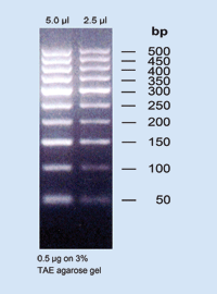 進行水平電泳時,作為DNA片段大小之標準,50bp DNA分子量標準液會提供間斷為50bp的10個標準DNA堿基對,它們清晰地分布在50bp到500bp之間,其中300bp堿基對的亮度是其他堿基對的3倍以上