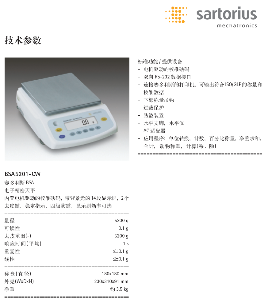 > 賽多利斯BSA5201-CW精密天平,0.1g/5200g 內(nèi)校