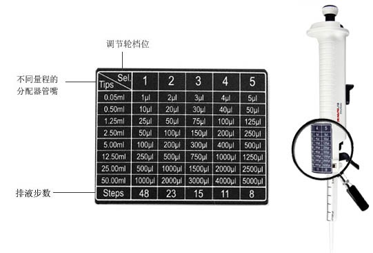 - 7種不同規(guī)格的聚丙烯分配器管嘴可供選擇,量程從0.5ml到50ml