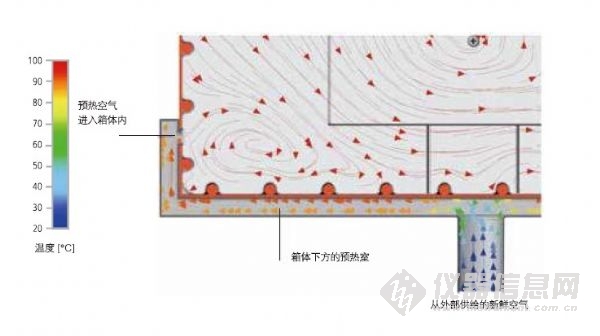 由于輸入的新鮮空氣引起的溫度偏差會影響測試樣品的特性或者延長樣品烘干時(shí)間,因此,對于MEMMERT通用烘箱,新鮮空氣先被供給到預(yù)熱室中預(yù)熱,然后引入箱體內(nèi)。