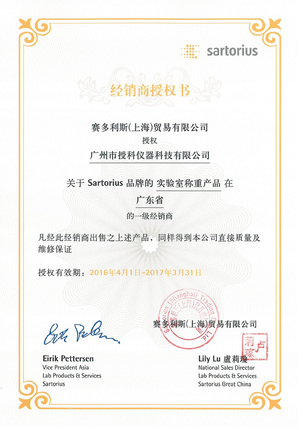 > 賽多利斯2016年代理證書(shū)