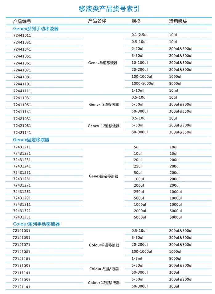 寶予德Colour系列移液器,其下涵蓋單道微量可調(diào)移液器0.5-1000ul,單道可調(diào)大體積移液器1-5ml和多道微量可調(diào)移液器5-300ul。產(chǎn)品規(guī)格齊全,滿足您日常移液需求。