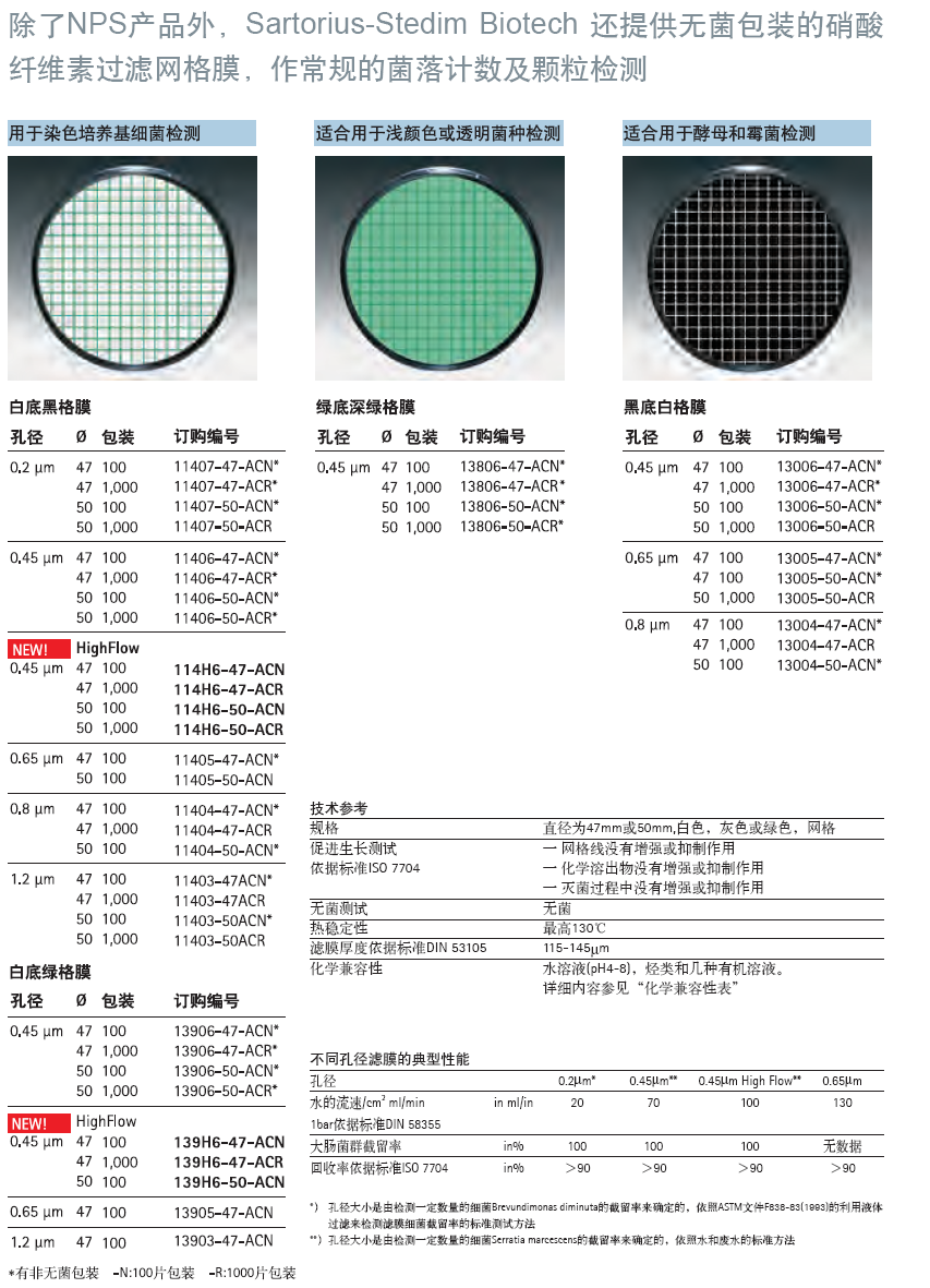 膜過濾器有多種不同的孔徑和三種類型的材質(zhì)。硝酸纖維素(纖維素酯混合物)過濾器含有硝酸纖維素和醋酸纖維素的混合物,能確保高效的截留效果和高流速性能,適用于光學(xué)菌落計數(shù)。醋酸纖維素則結(jié)合了高流速,熱穩(wěn)定性,同時具有低吸附的性能特點(diǎn)。 過濾器有多種顏色,可與菌落或微粒形成強(qiáng)烈對比,使得菌落的定量計數(shù)和識別都變得容易而可靠。