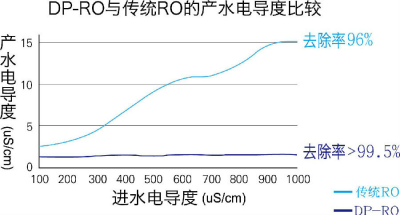 * 專利的DP-RO深度除鹽技術能提升系統(tǒng)的總體除鹽率達到99.5%以上,降低原水水質(zhì)變化造成的影響,并在原水電導率不超過1000 μS/cm的情況下穩(wěn)定產(chǎn)出符合ISO標準的三級水,同時大幅度改善了系統(tǒng)的耐用度、延長超純化濾芯的使用壽命,并降低了超純水的生產(chǎn)成本,解決了連續(xù)電除鹽技術所帶來的高購置及高頻率維護成本。