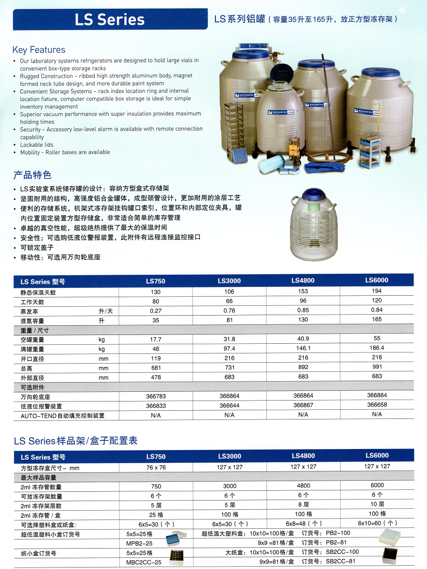 > 泰萊華頓液氮罐 LS系列鋁罐(容量35-165升,放正方形凍存架)