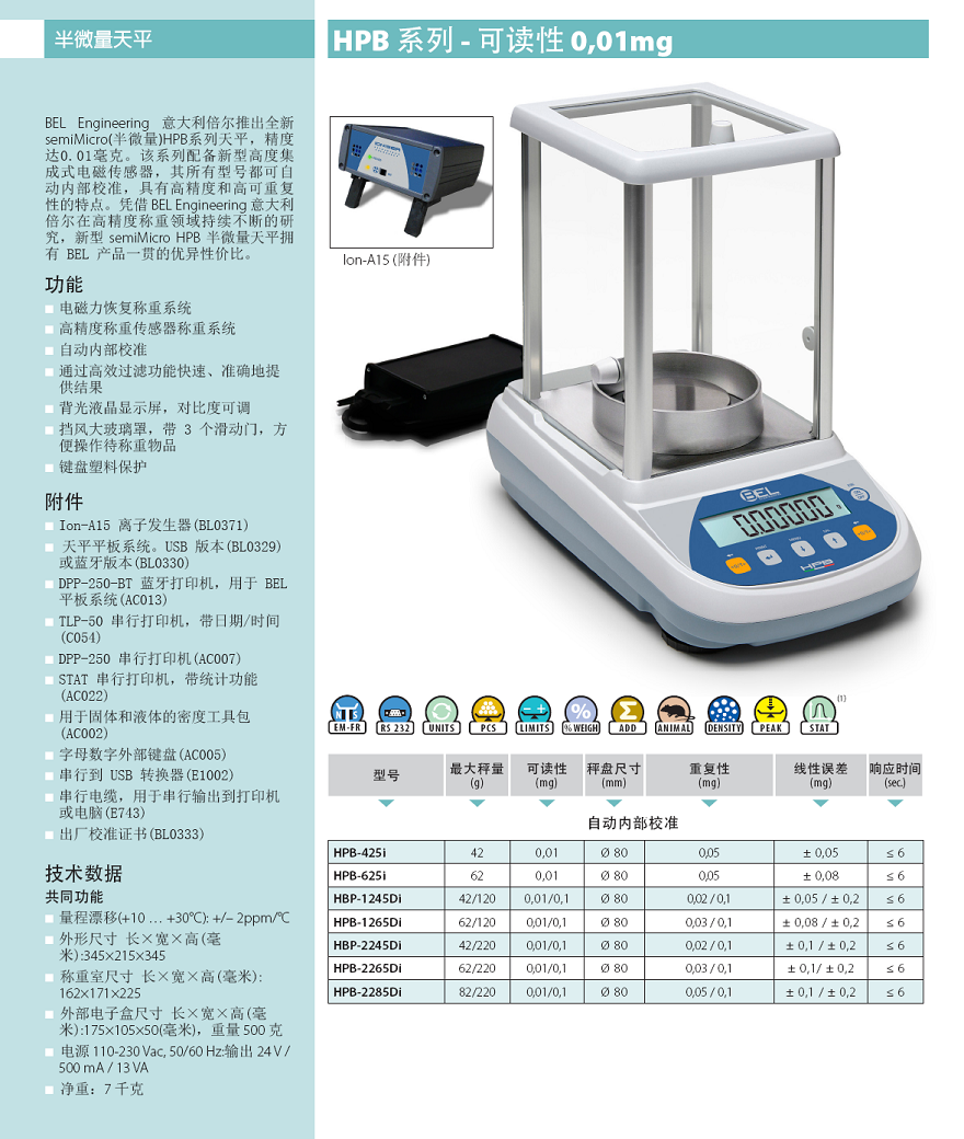 意大利倍爾推出全新semiMicro(半微量)HPB系列天平,精度達(dá)0.01毫克。該系列配備新型高度集成式電磁傳感器,其所有型號(hào)都可自動(dòng)內(nèi)部校準(zhǔn),具有高精度和高可重復(fù)性的特點(diǎn)。憑借 BEL Engineering 意大利倍爾在高精度稱(chēng)重領(lǐng)域持續(xù)不斷的研究,新型 semiMicro HPB 半微量天平擁有 BEL 產(chǎn)品一貫的優(yōu)異性?xún)r(jià)比。