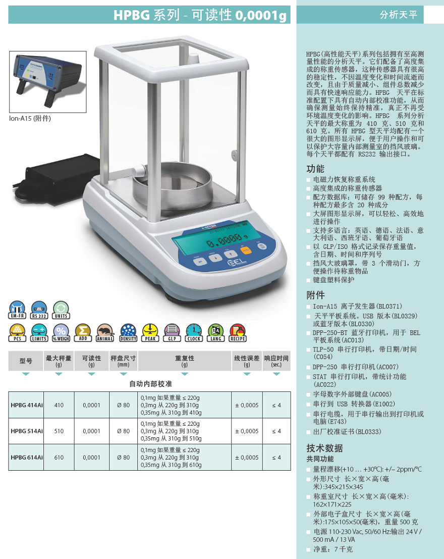 產(chǎn)品型號(hào):HPBG 614Ai: 量程610g,精度0.1mg
