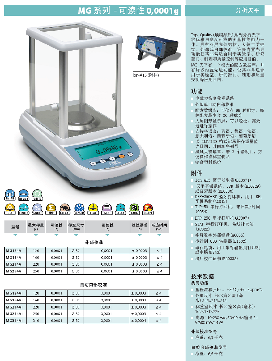 | 意大利倍爾MG124A分析天平,0.1mg/120g,外校,大屏幕顯示,原裝進口 |