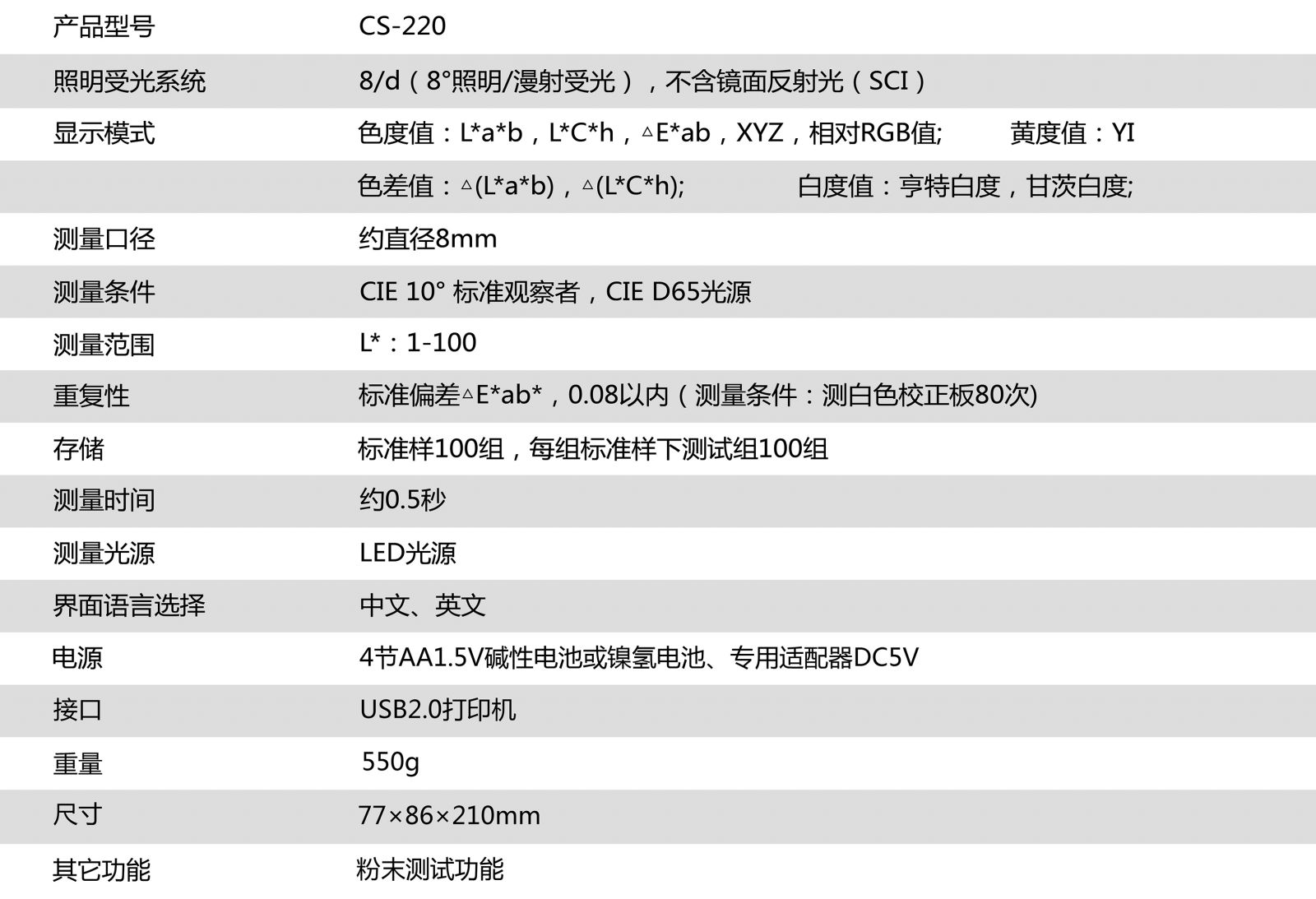 CS-220精密色差儀,廣泛應(yīng)用于塑膠、印刷、油漆油墨、紡織、印染服裝等行業(yè)的顏色管理領(lǐng)域,根據(jù)CIE色空間測量樣品色值L*a*b、L*c*h,與被測樣品的色差△E以及 △Lab值。
