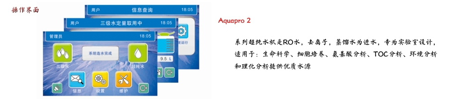 Aquapro 2C系列超純水機,是以RO水、去離子水或蒸餾水為進水,采用創(chuàng)新專利發(fā)明的全智能控制系統(tǒng),專為實驗室設計,適用于分子生物學及生命科學,細胞培養(yǎng),氨基酸分析,TOC分析,環(huán)境監(jiān)測,一般理化分析等實驗項目