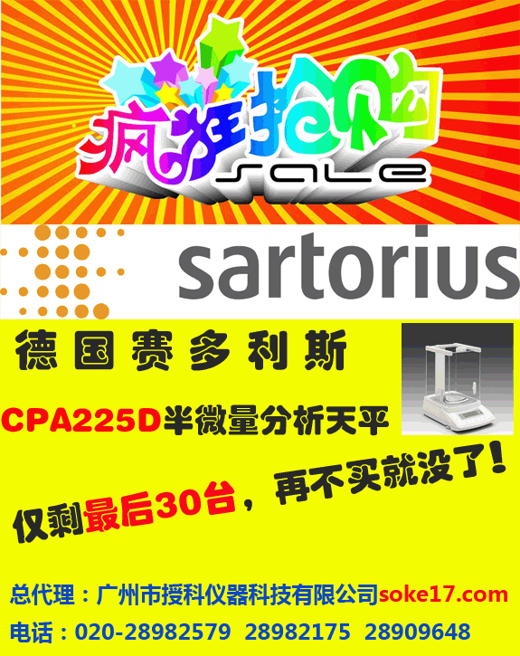 我們非常高興的告訴大家,作為德國(guó)賽多利斯Sartorius的戰(zhàn)略合作伙伴,作為賽多利斯Sartorius華南區(qū)最大的一級(jí)代理商好維修服務(wù)中心,我們?cè)诘聡?guó)賽多利斯Sartorius集團(tuán)的支持下,為了慶祝賽多利斯Sartorius德國(guó)總部2016年8月份新廠房的勝利完工,以及廣州市授科儀器科技有限公司CEO即將應(yīng)賽多利斯Sartorius德國(guó)總部邀請(qǐng)參加德國(guó)賽多利斯Sartorius總部工廠搬遷慶典,我們特別拿出賽多利斯Sartorius經(jīng)典系列天平CPA225D系列進(jìn)行促銷(xiāo)活動(dòng),價(jià)格特別優(yōu)惠,現(xiàn)貨供應(yīng),需要的客戶請(qǐng)盡快聯(lián)系我們!