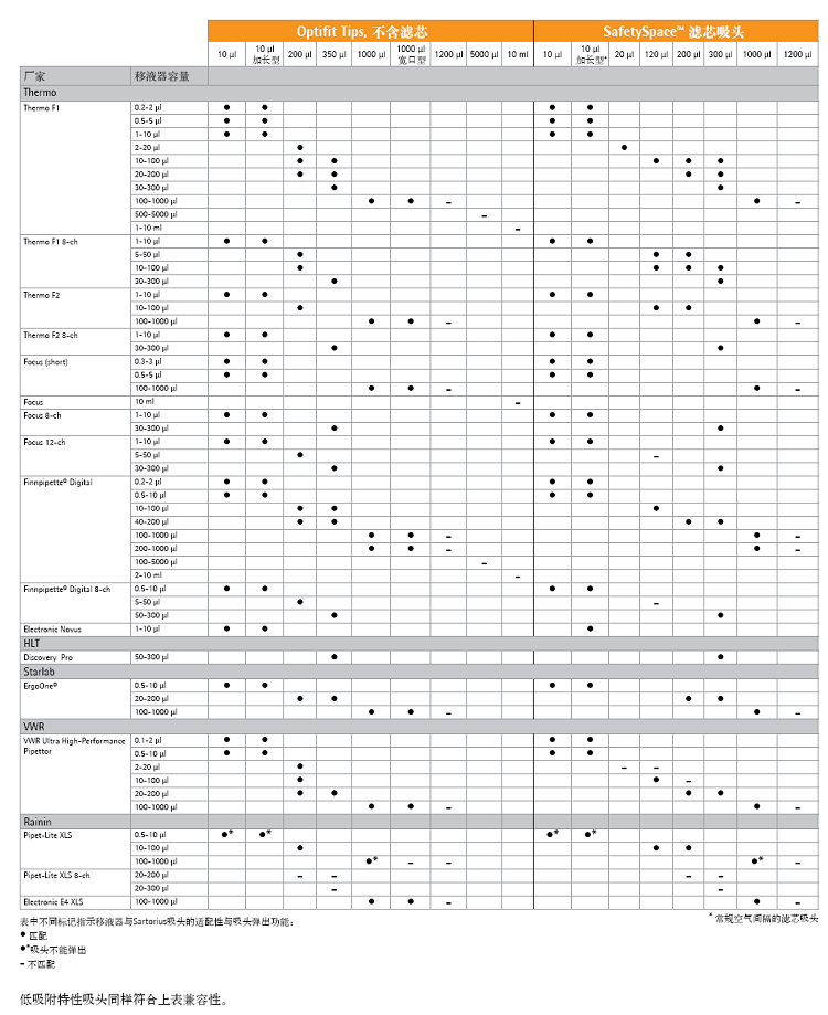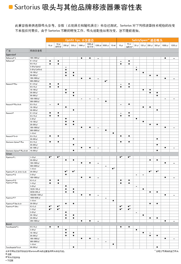 賽多利斯吸頭與其他品牌移液器兼容性一覽表