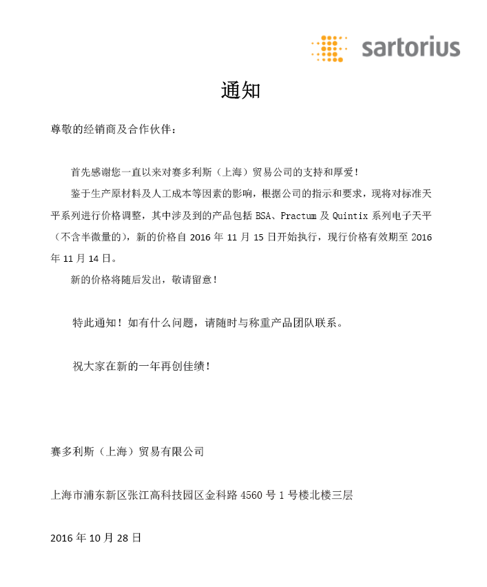 賽多利斯天平11月15日要漲價啦!