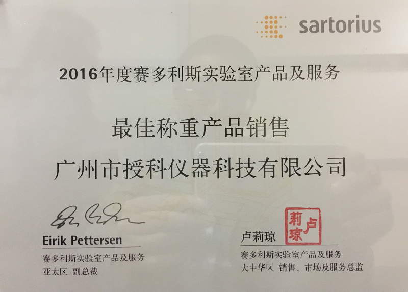 我們欣喜的告訴大家,經過2016年的不懈努力,以及客戶對我們的大力支持,和客戶對我們專業(yè)服務的95%以上的滿意度,經過賽多利斯集團總部的多輪評比,我們非常高興的告訴大家,我們榮幸的得到了的德國賽多利斯在中國頒發(fā)的最高獎項—賽多利斯2016年度中國區(qū)最佳銷售獎!