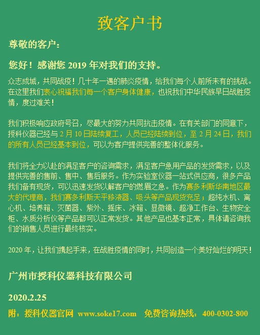 我們積極響應(yīng)政府號召,盡最大的努力共同抗擊疫情。在有關(guān)部門的同意下,授科儀器已經(jīng)與2月10日陸續(xù)復(fù)工,人員已經(jīng)陸續(xù)到位,至2月24日,我們的所有人員已經(jīng)基本到位,可以為客戶提供完善的整體化服務(wù)。