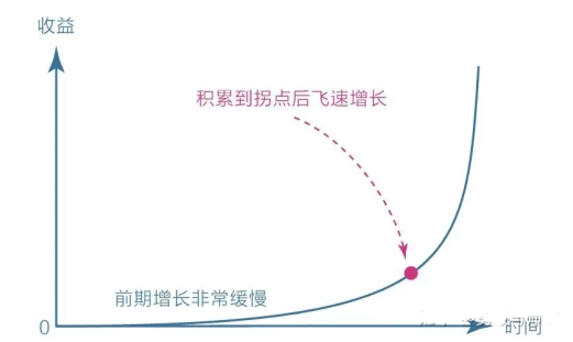 1、復(fù)利曲線:復(fù)利曲線是一種理性工具,復(fù)利效應(yīng)顯示了價值積累的普遍規(guī)律;前期增長非常緩慢 ,但到達一個拐點后會飛速增長,其實就是前期量的積累,引起后來的質(zhì)的飛躍。前期積累的過程可能很長很痛苦,但在于堅持,堅持到拐點的到來。