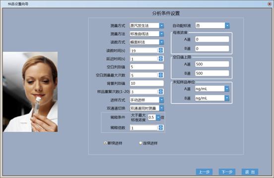 輸入各通道下的各“標(biāo)液濃度”,按“下一步”,進(jìn)入的是未知的樣品設(shè)置如下所示: