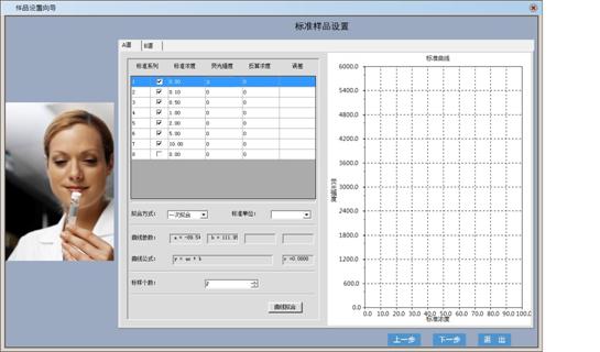 以上窗口為“手動(dòng)進(jìn)樣+雙蠕動(dòng)泵”流程下的界面,設(shè)置完成后,按“下一步”,彈出“標(biāo)準(zhǔn)曲線設(shè)置”對(duì)話框,如下所示: