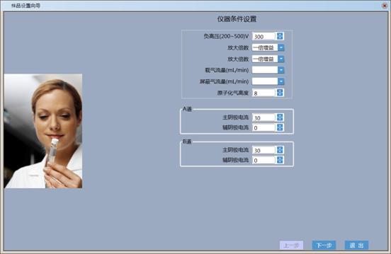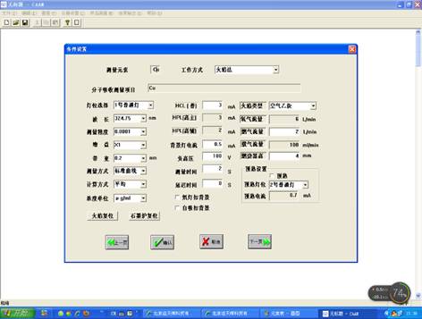 設(shè)置儀器條件,包括各通道燈電流及配比,負(fù)高壓,載氣和屏蔽氣流量和原子化器高度,按“下一步”,進(jìn)入“分析條件”設(shè)置,如下所示:
